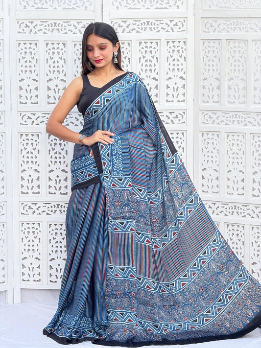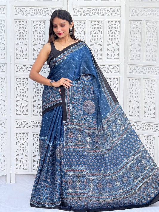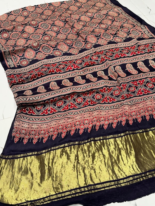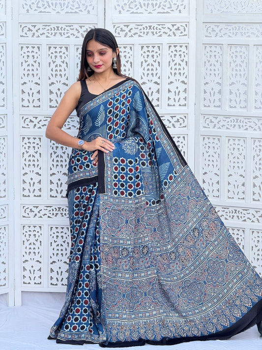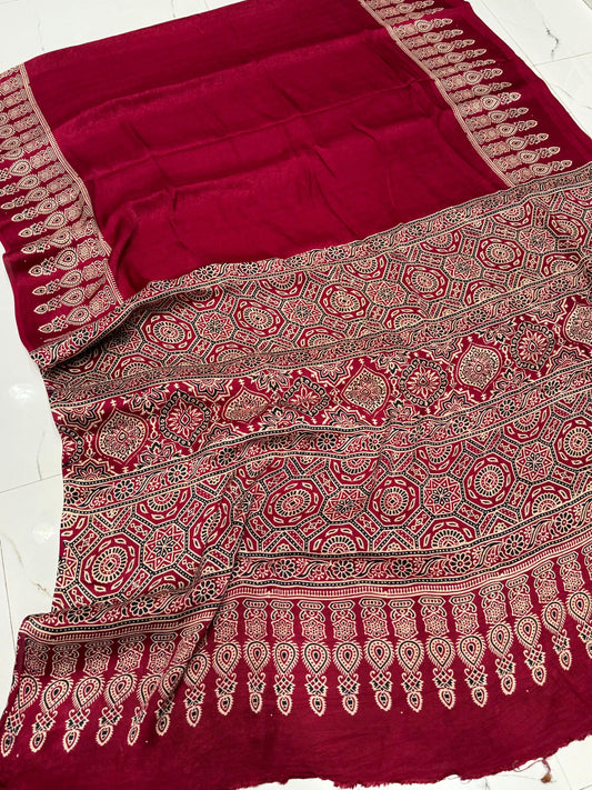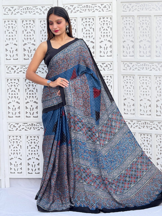 New Ajrakh Modal Silk Ajrakh Fancy Pallu Saree Available in modal silk ajrakh natural mill...