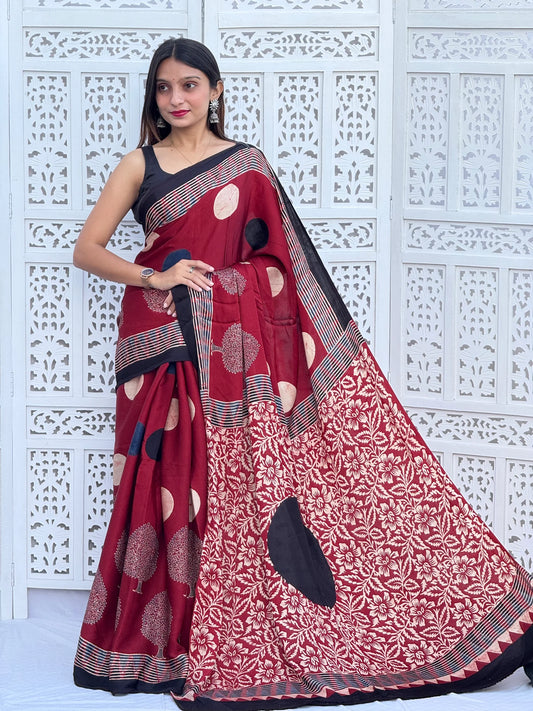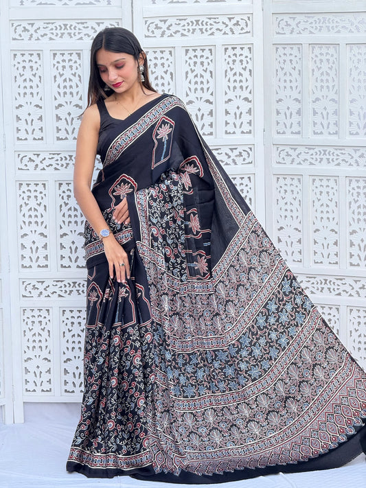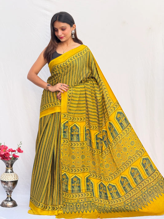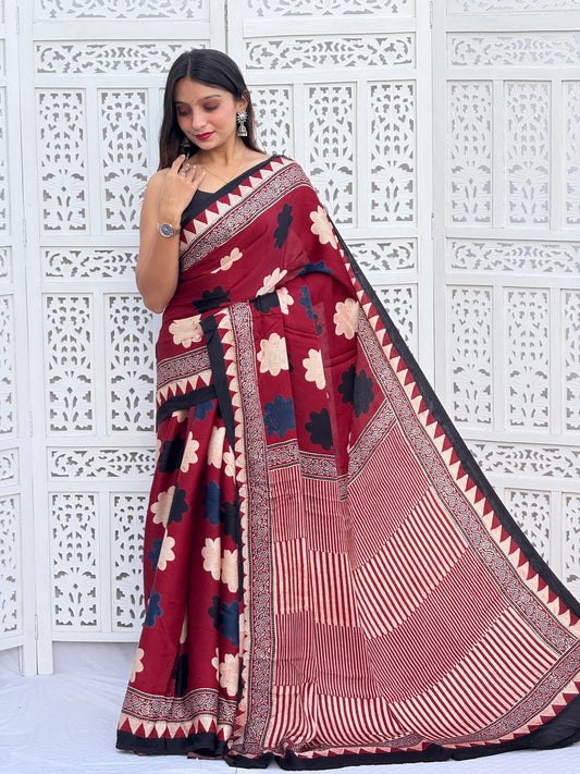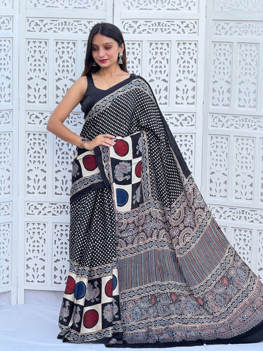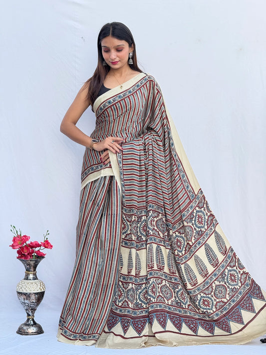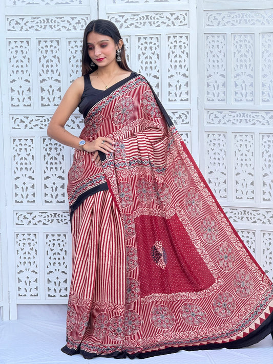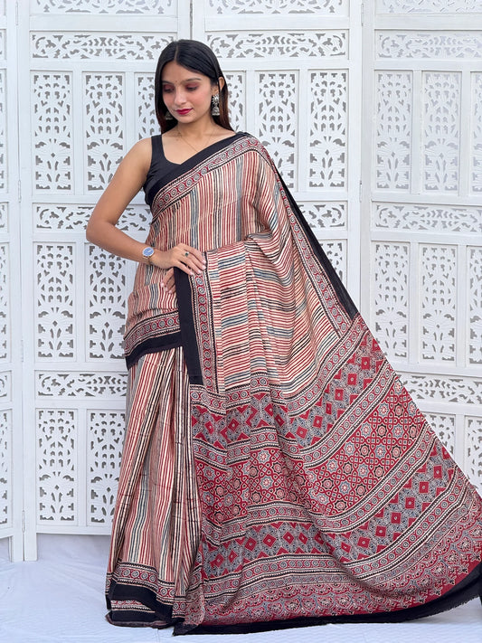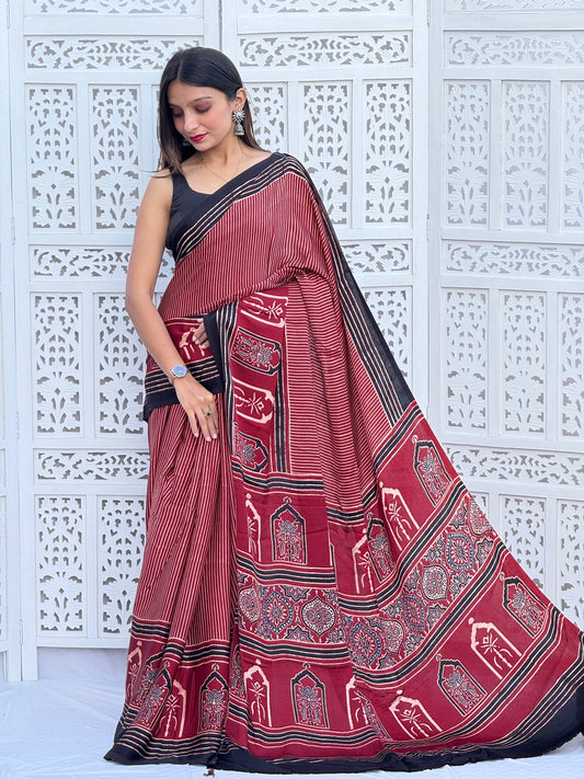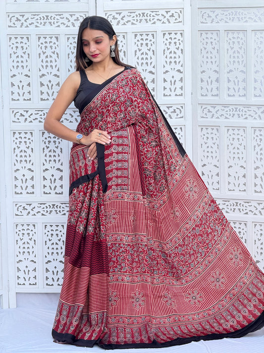 Enhance your wardrobe with this stunning modal silk saree. The Ajrakh design offers intricate hand-block...