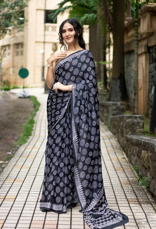 Enhance your wardrobe with this stunning modal silk saree. The Chaos Plan Ajrakh design offers...