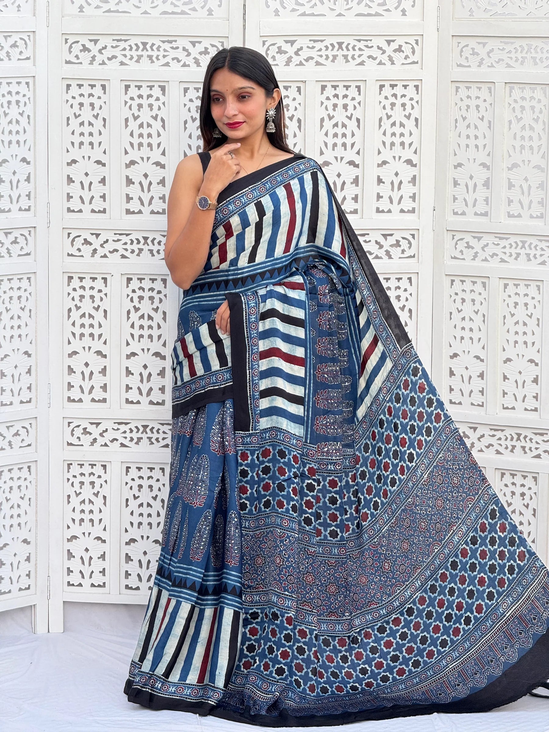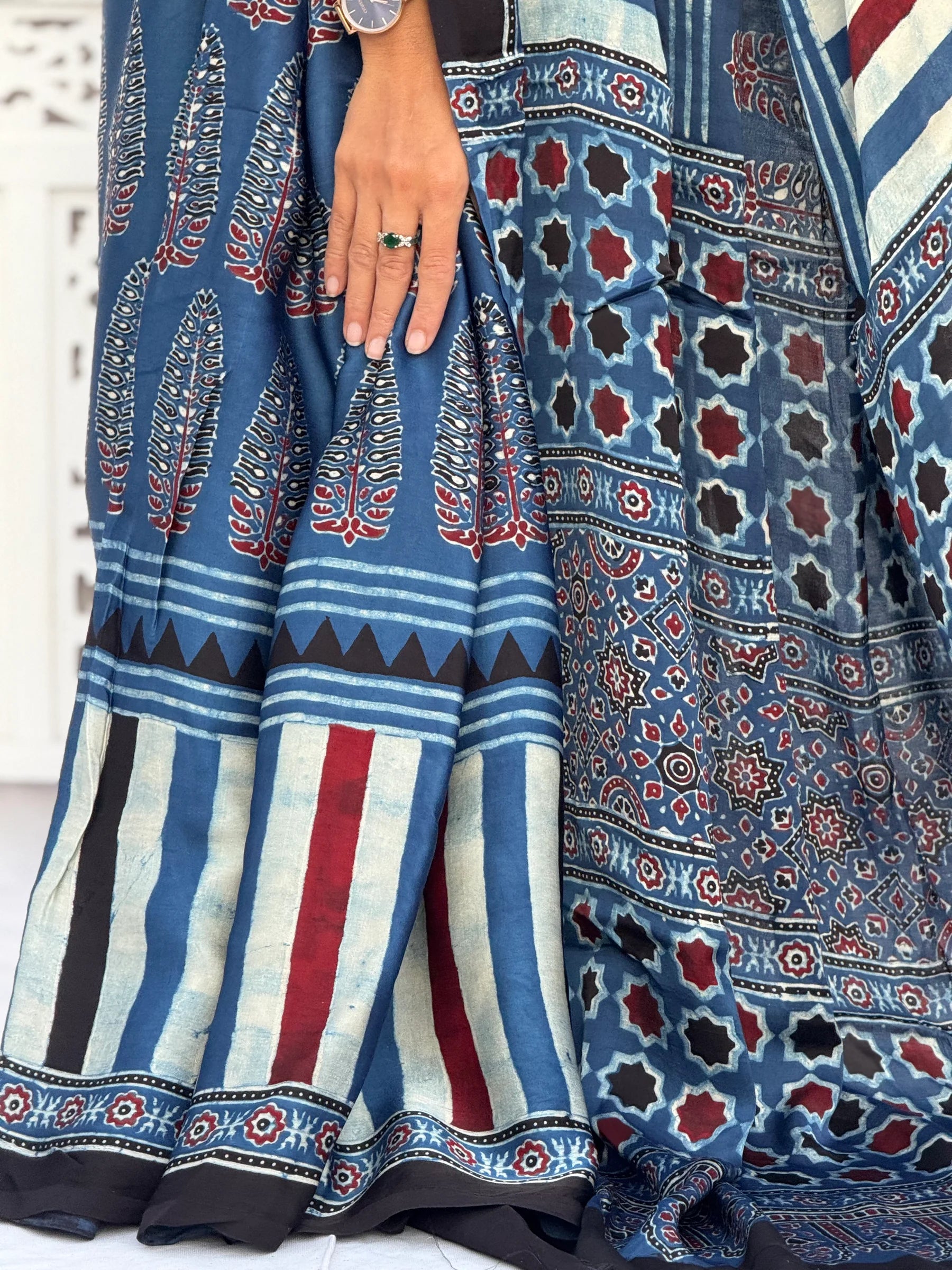 Enhance your wardrobe with this stunning modal silk saree. The Ajrakh design offers intricate hand-block printing, creating a unique blend of traditional and modern art. Show off your style with a piece that's sure to turn heads.