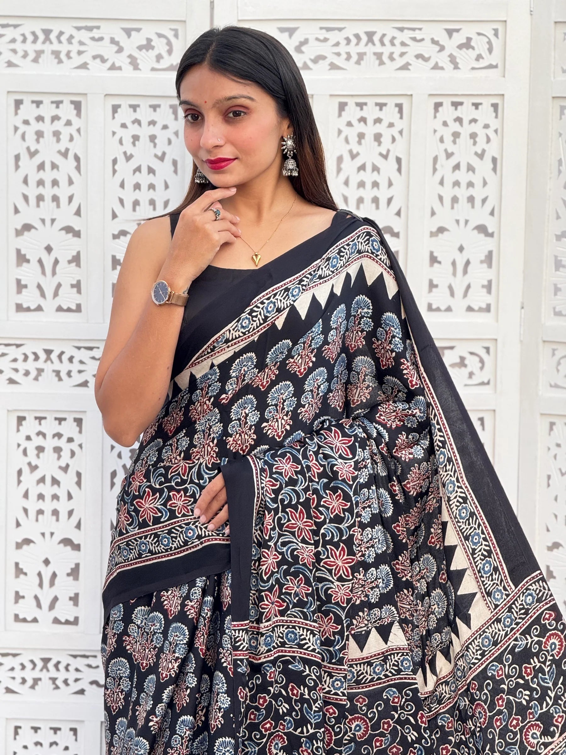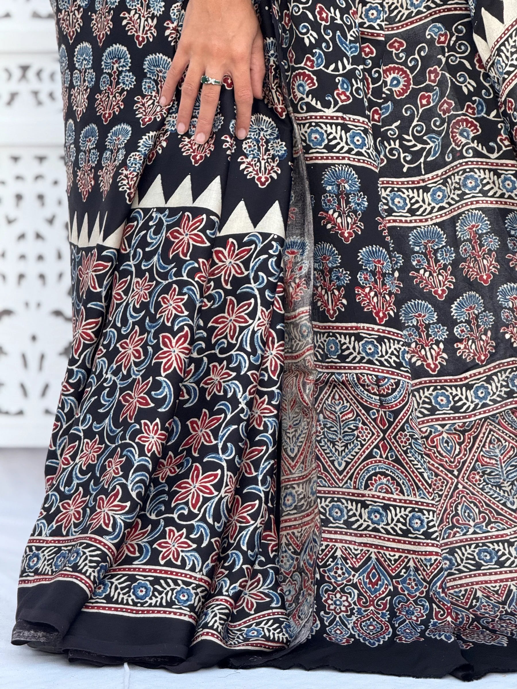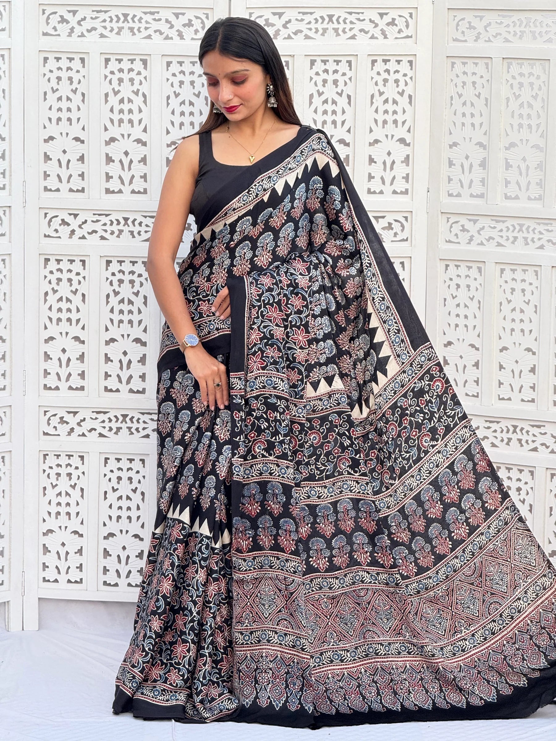 Enhance your wardrobe with this stunning modal silk saree. The Ajrakh design offers intricate hand-block printing, creating a unique blend of traditional and modern art. Show off your style with a piece that's sure to turn heads.