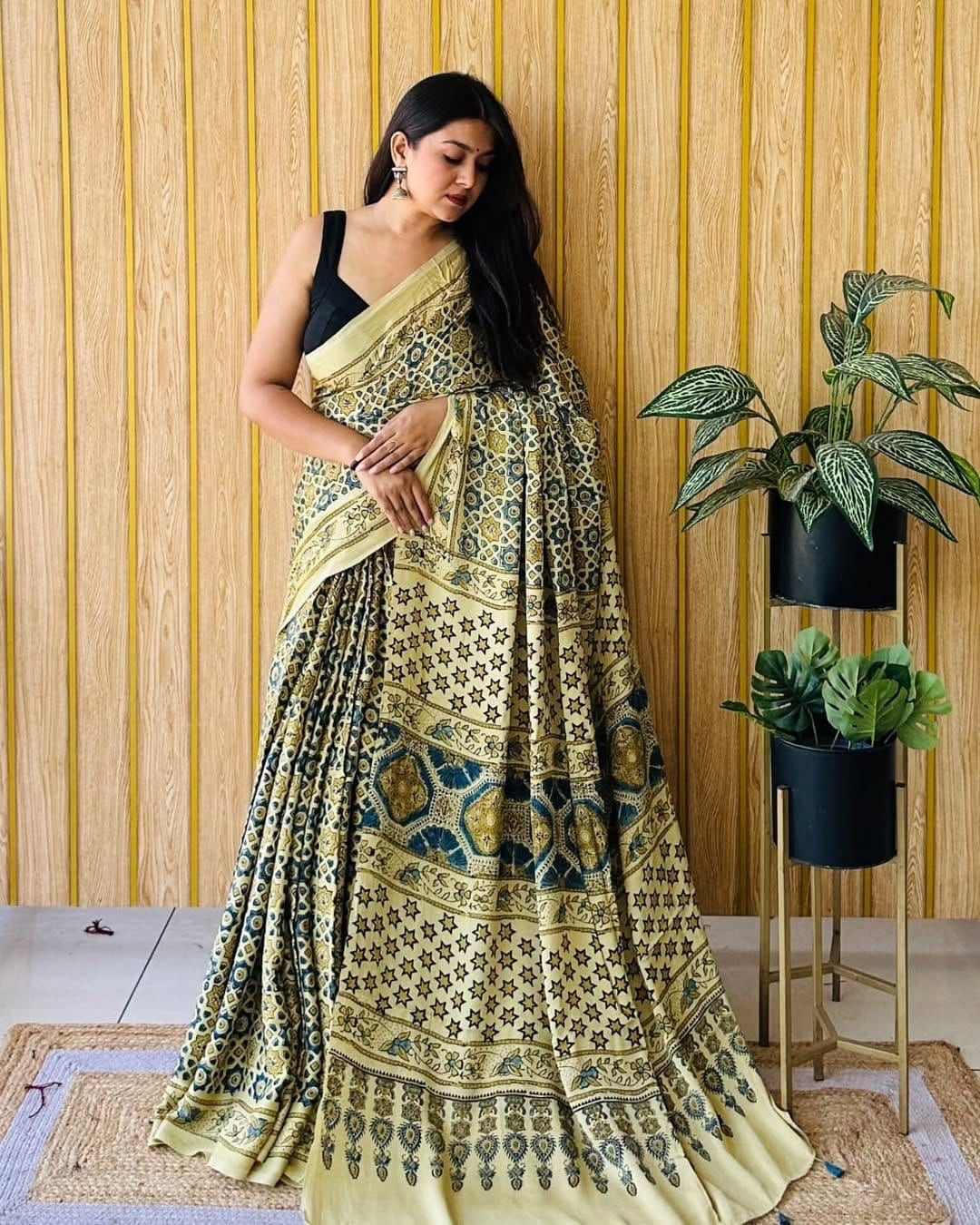 Available in semi gaji silk ajrakh natural digital print saree with ajrakh and fancy ajrakh pallu saree Same fabric Ajrakh blouse.
