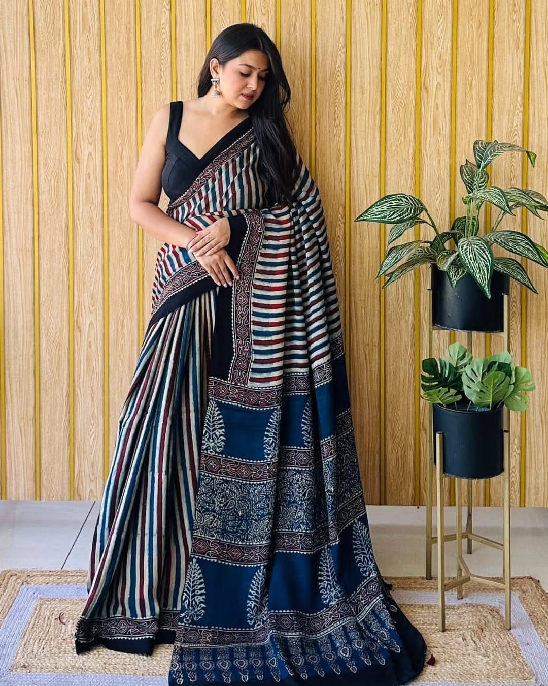 Saree work : Digital Print Border with Ajrakh Rich Pallu With Contrast Blouse
