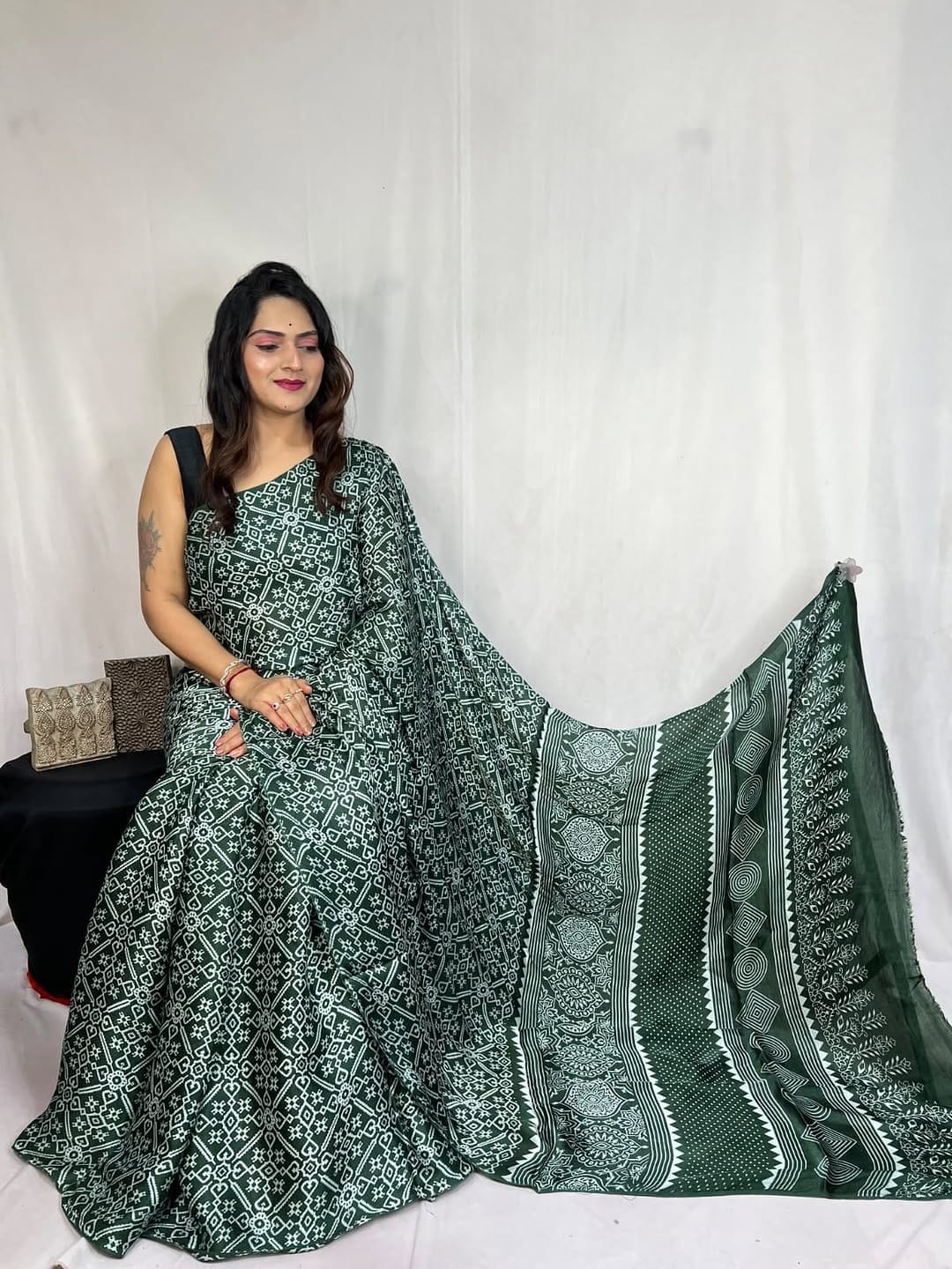 Available in semi gaji silk ajrakh natural digital print saree with ajrakh and fancy ajrakh pallu saree Same fabric Ajrakh blouse.