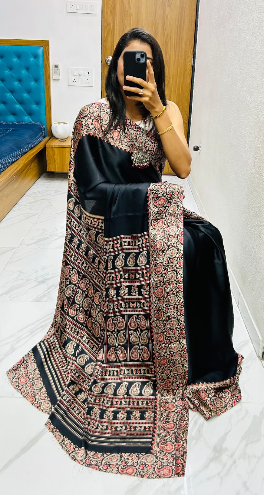 Beautiful Black Ajrakh Pure Gajji Silk Saree WIth Tassel