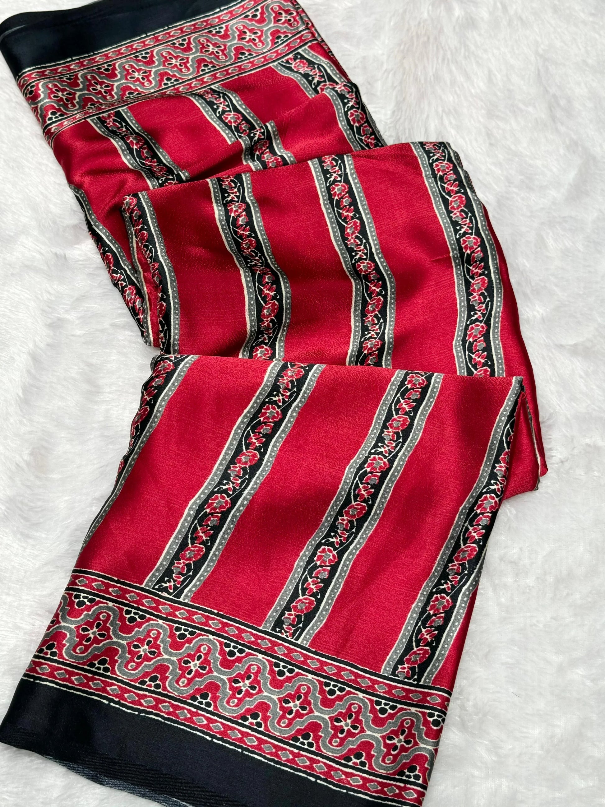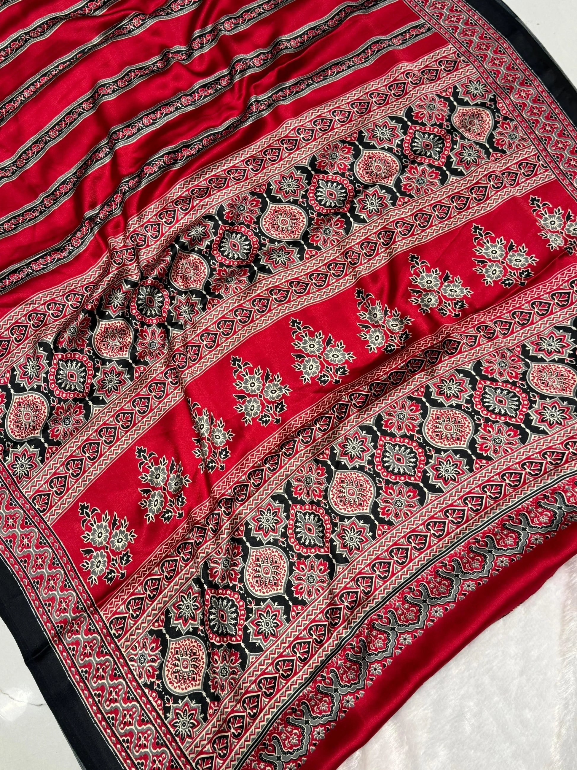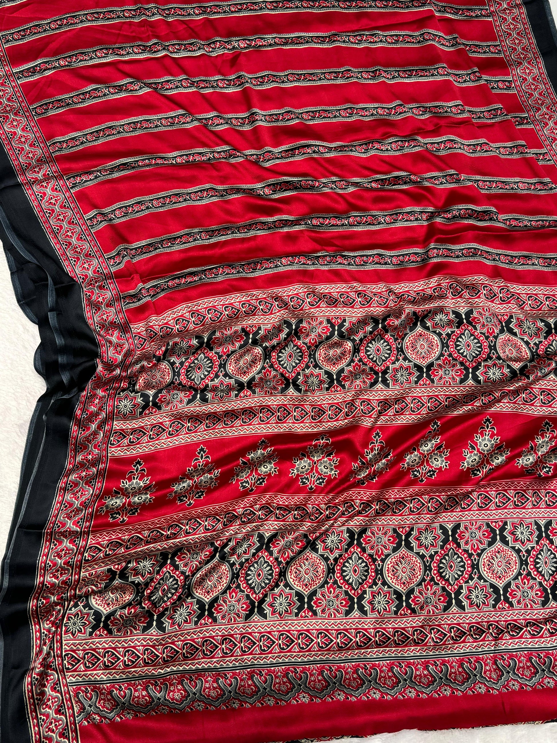 Black And Maroon Ajrakh Printed Soft Modal Silk Natural Print Saree