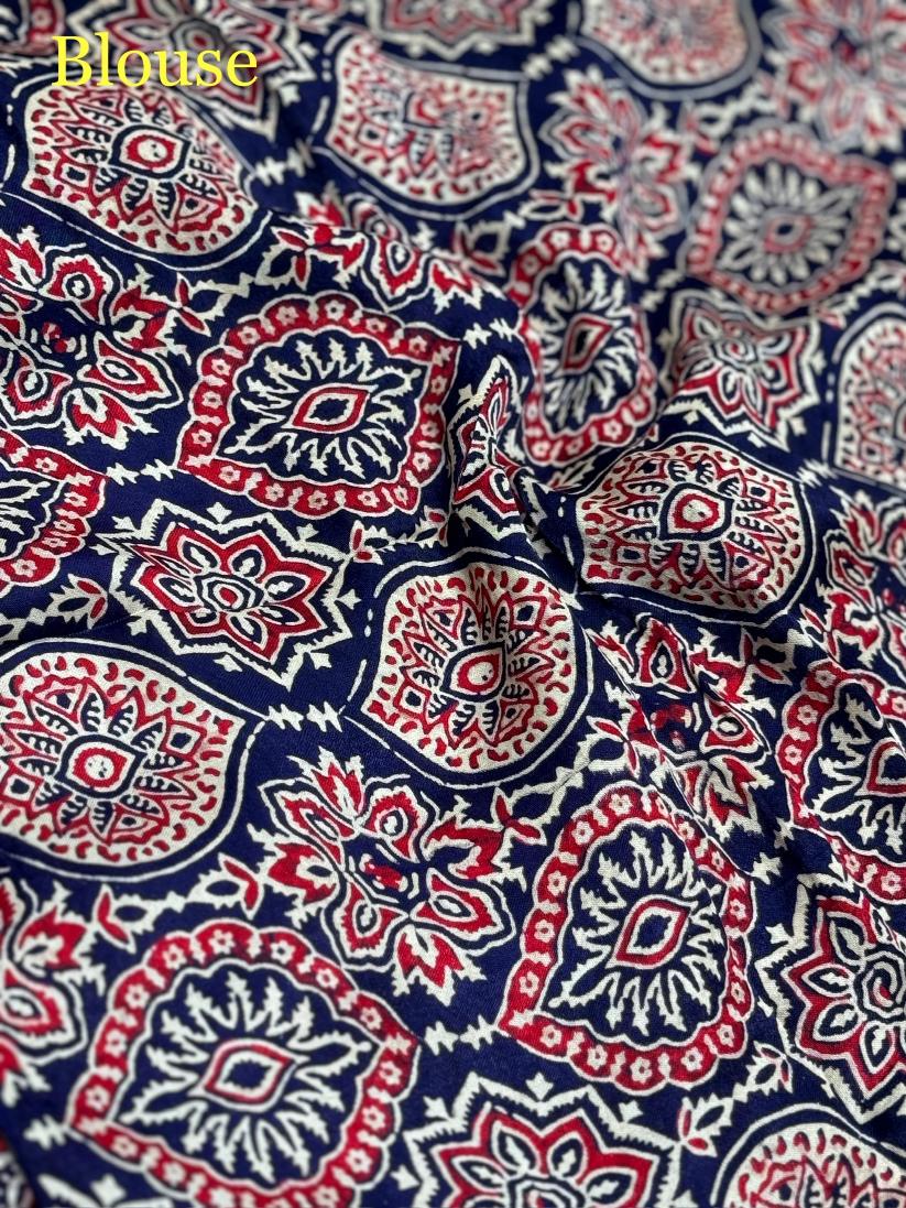 Available in modal silk ajrakh natural mill print saree with ajrakh and fancy ajrakh pallu saree.*Same fabric Bandhni blouse.