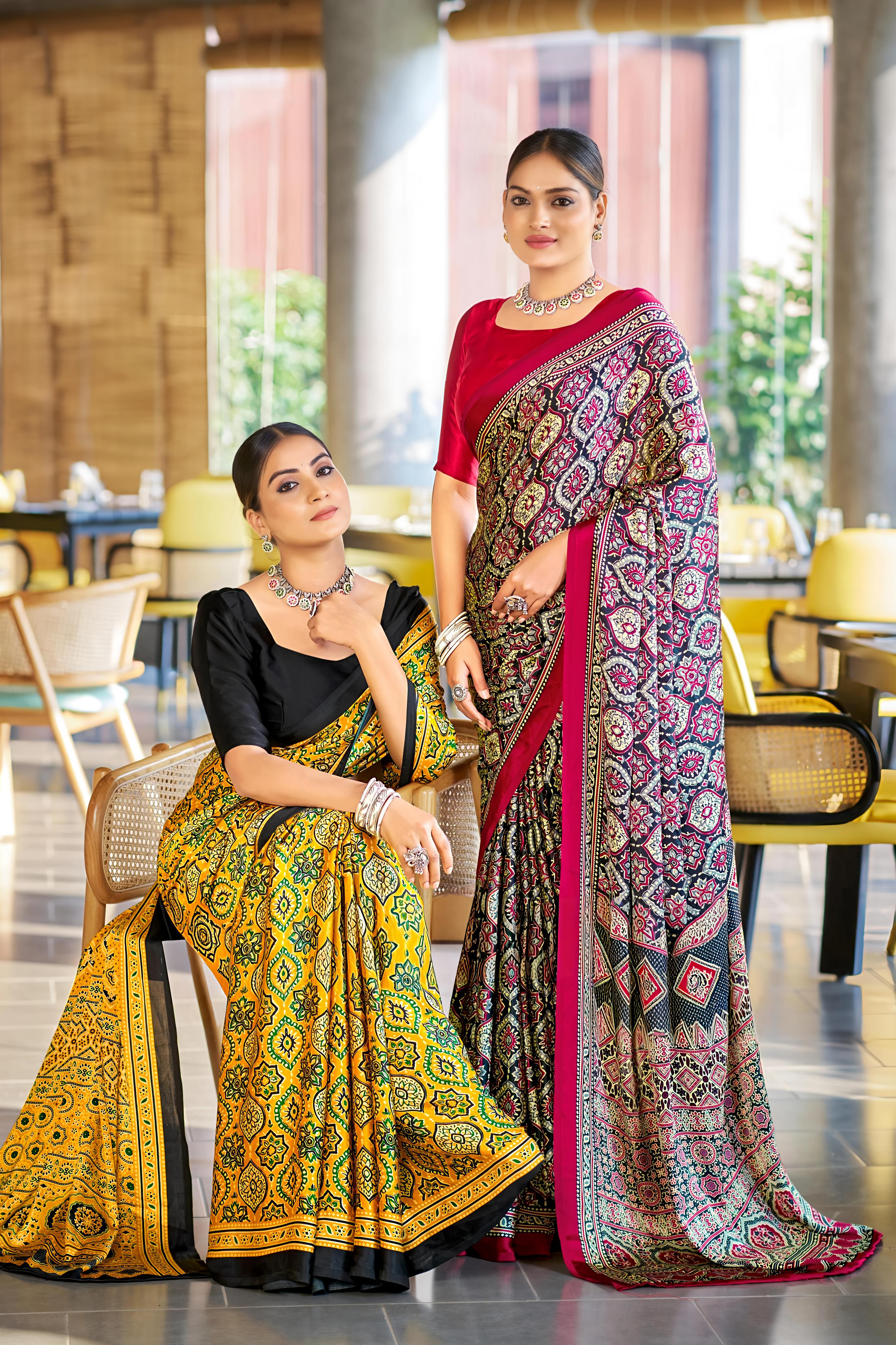 Available in modal silk ajrakh natural mill print saree with ajrakh and fancy ajrakh pallu saree.*Same fabric Bandhni blouse.