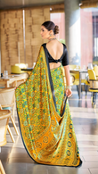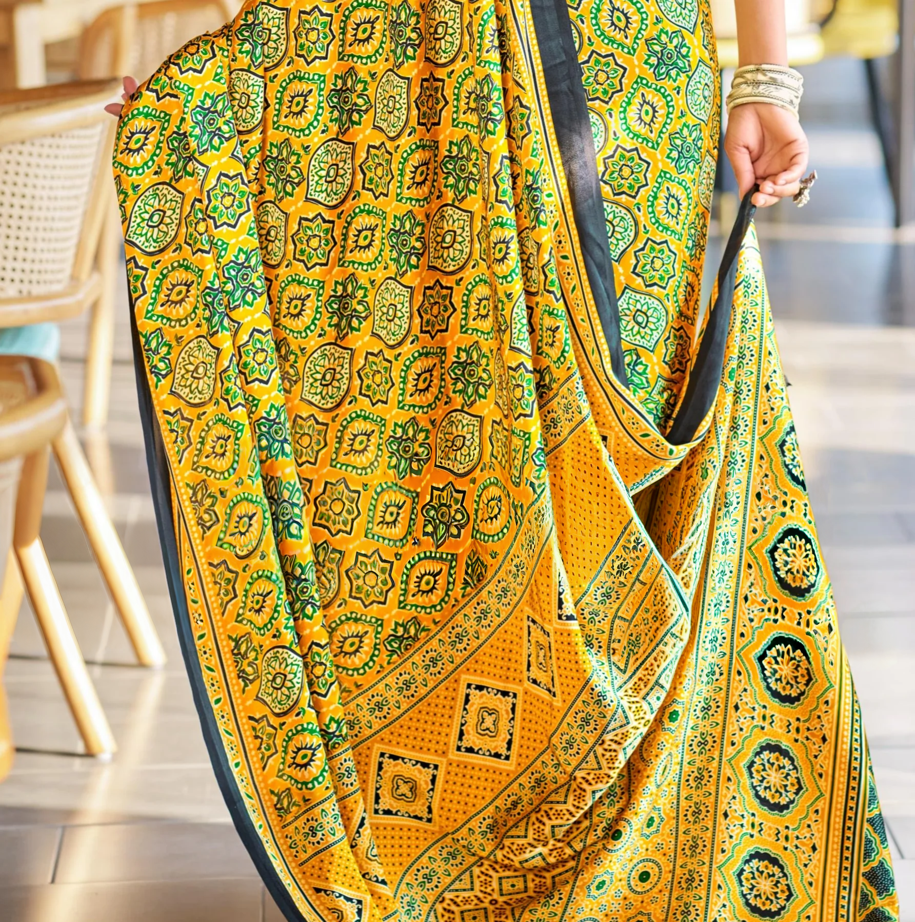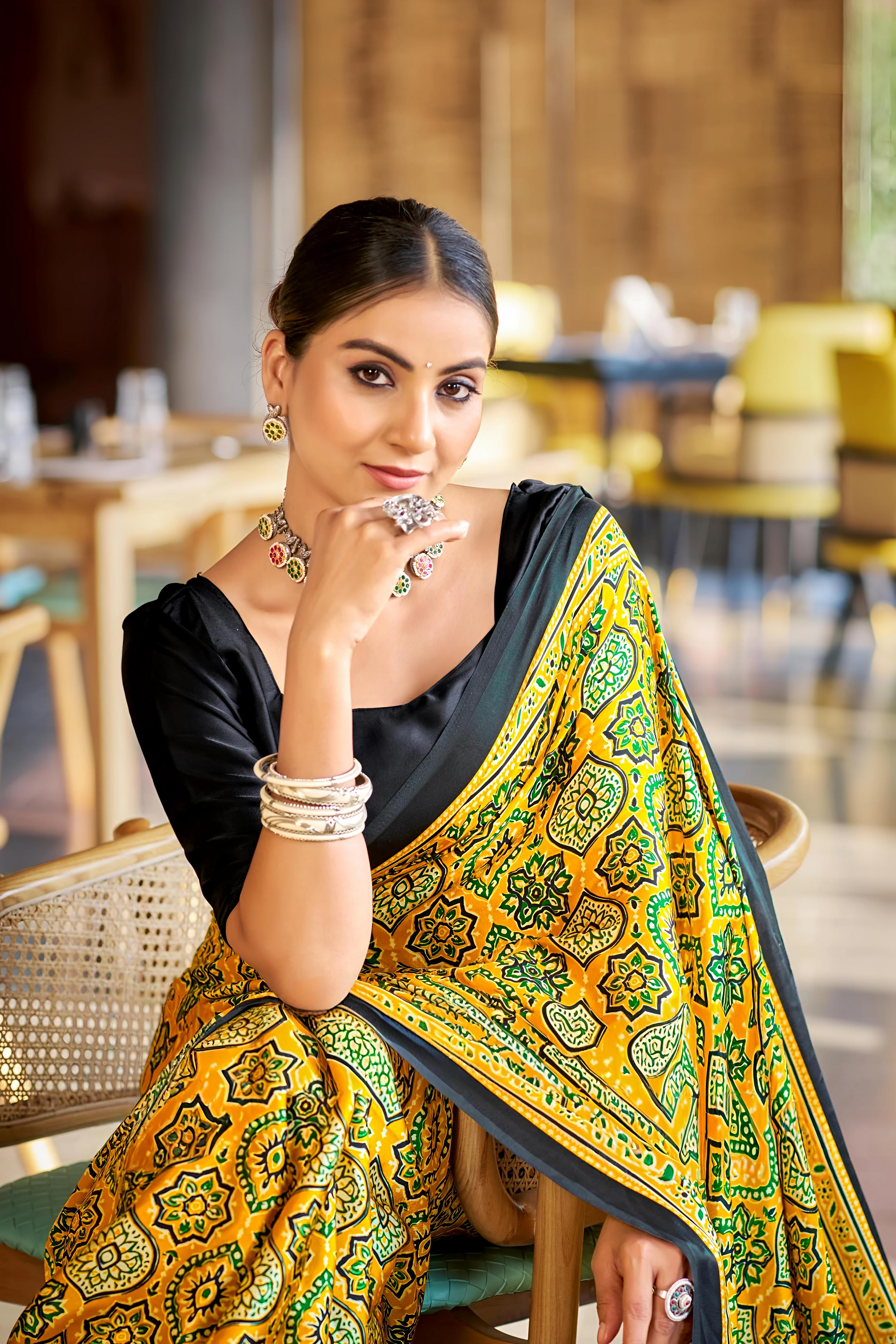 Brilliant Yellow Ajrakh Printed Soft Modal Silk Natural Print Saree