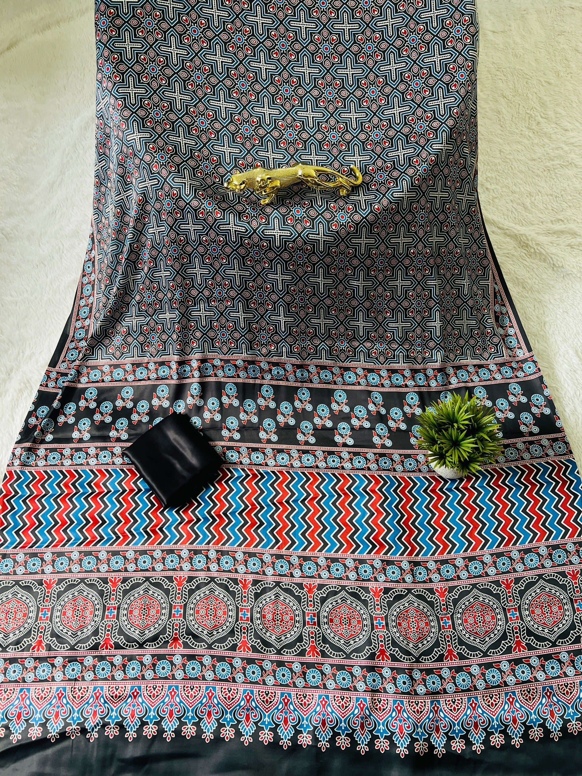 Available in semi gaji silk ajrakh natural digital print saree with ajrakh and fancy ajrakh pallu saree Same fabric Ajrakh blouse.