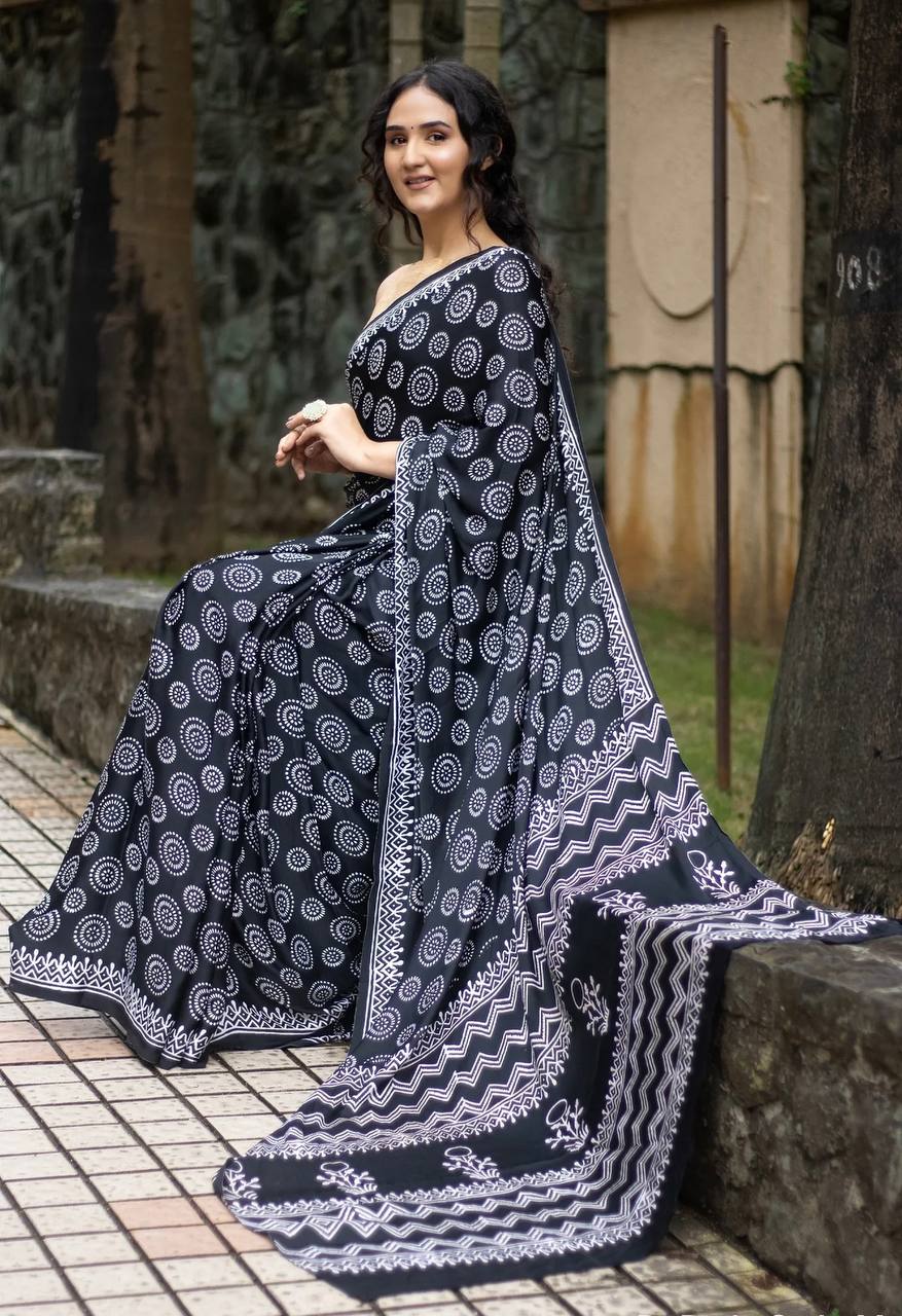 Enhance your wardrobe with this stunning modal silk saree. The Chaos Plan Ajrakh design offers intricate hand-block printing, creating a unique blend of traditional and modern art. Show off your style with a piece that's sure to turn heads.