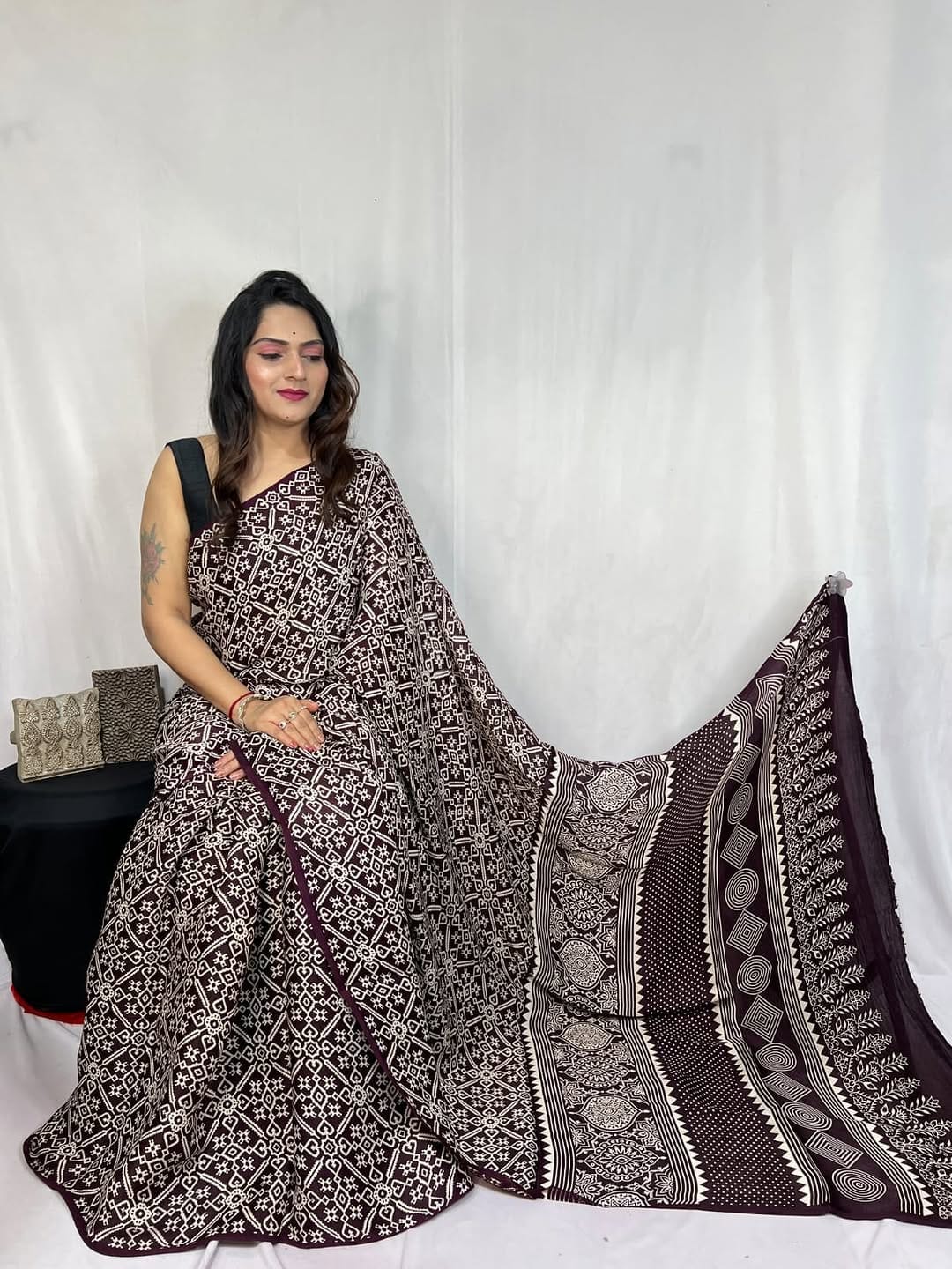 Available in semi gaji silk ajrakh natural digital print saree with ajrakh and fancy ajrakh pallu saree Same fabric Ajrakh blouse.