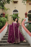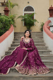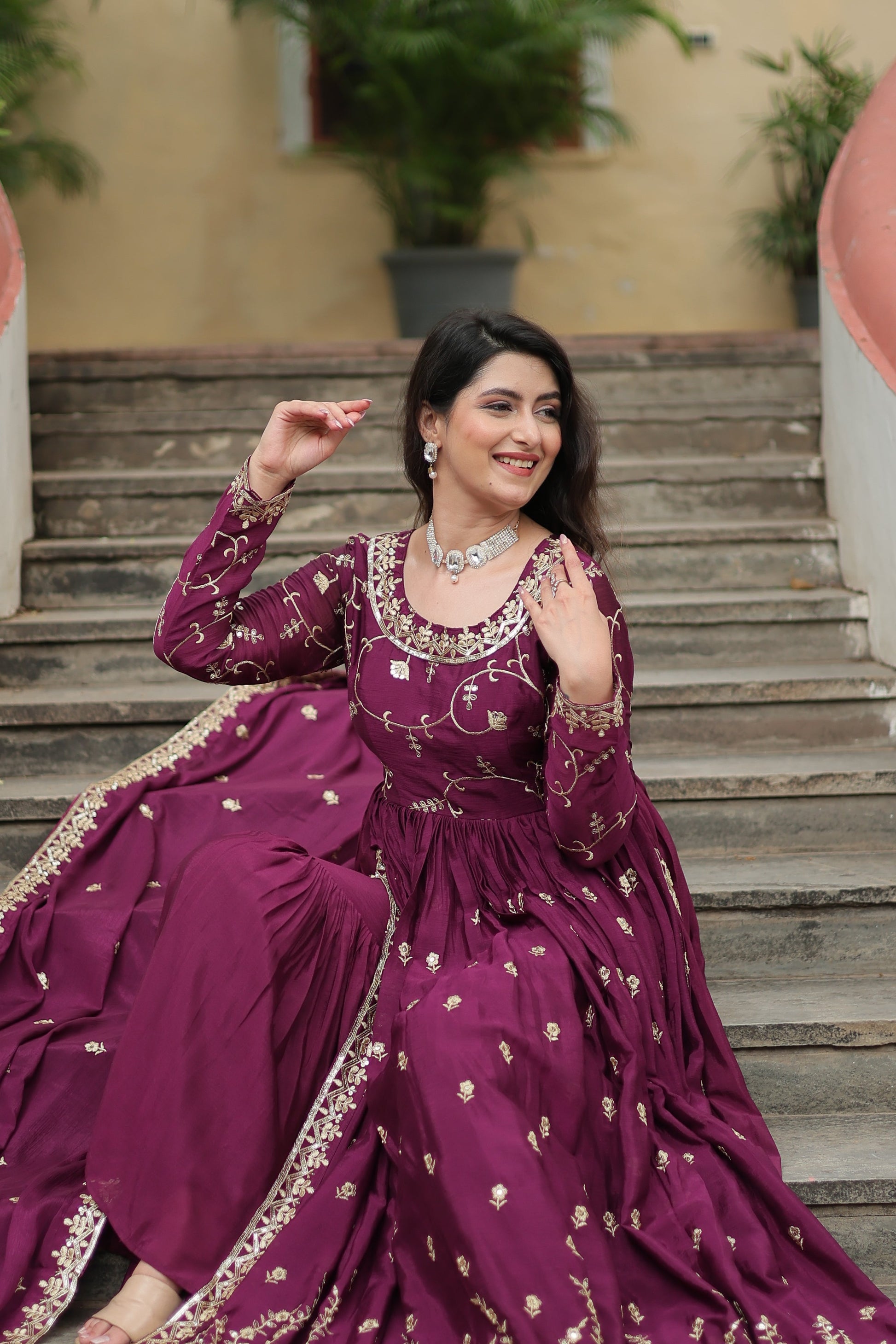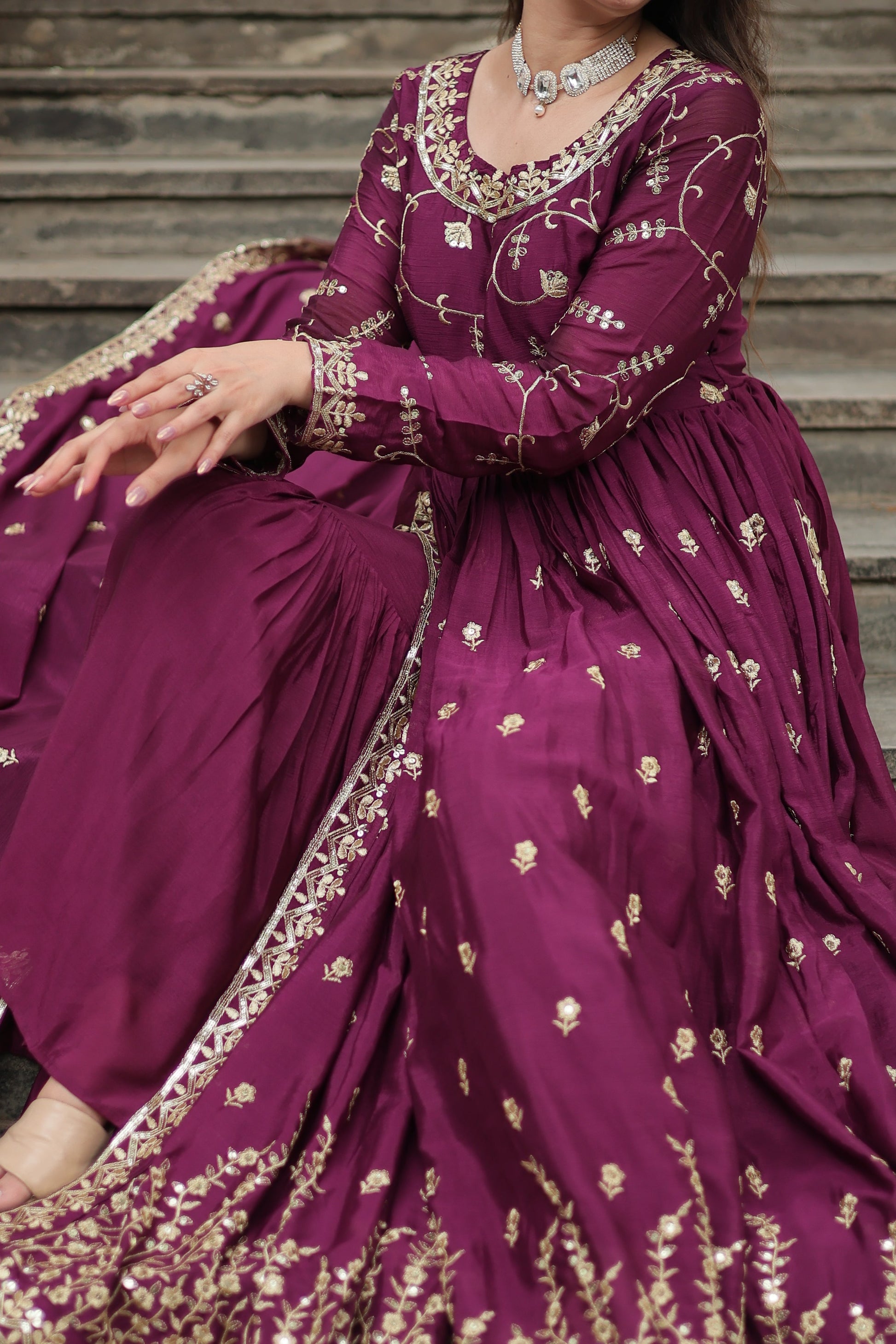 Wine Designer Readymade Top-Sharara-Dupatta Sequins Embroidered Chinon Suit