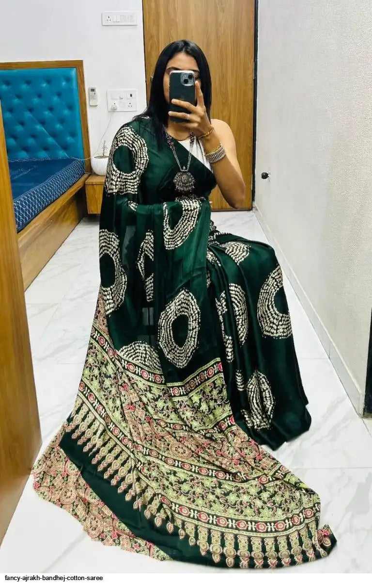 Green Ajrakh Primum Modal Silk Saree With Blouse
