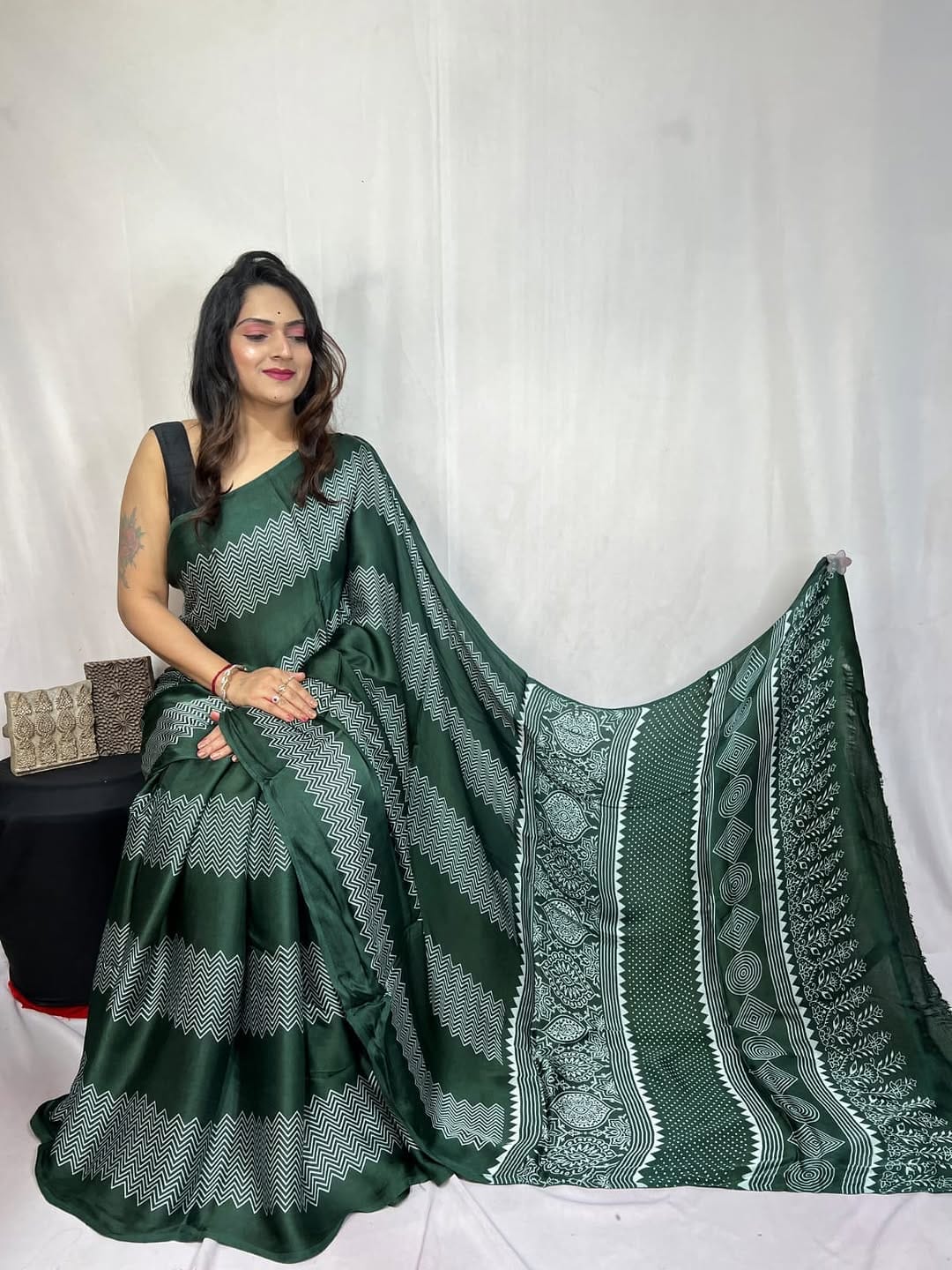 Green Ajrakh Primum Modal Silk Saree With Blouse