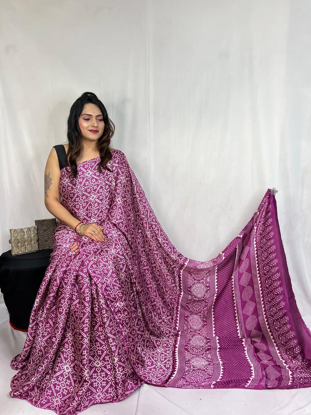 Available in semi gaji silk ajrakh natural digital print saree with ajrakh and fancy ajrakh pallu saree Same fabric Ajrakh blouse.